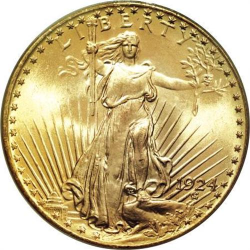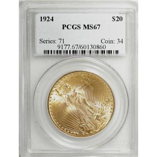 <B>1924 $20 MS67 PCGS.</B></I> The 1924 is one of the most widely available gold issues struck by any nation; figures from Garrett and Guth (2006) list a combined certified population of over 400,000 pieces, with untold others uncertified and outside the official figures. Unsurprisingly, the 1924 has become a popular type issue, with Choice and Gem pieces as the most popular choices.<BR> For the type or date enthusiast with an emphasis on high grade, however, a "mere" MS65 coin will not do; a piece such as the present Superb Gem is in order. Both sides offer powerful, swirling luster, and the orange-gold outer areas yield to paler straw-gold in the centers. The strike is sharp, and the overall quality is seemingly unimprovable. PCGS has graded only one finer example (11/07).<BR><I>From The Jacob Collection of Saint-Gaudens Double Eagles.</B></I><BR><BR><B>Coin Engraver:</B> Augustus Saint-Gaudens<BR><BR><b>Shipping:</b> Coins & Currency (<a target="_blank" href="http://www.heritageauctions.com/common/shipping.php">view shipping information</a>)