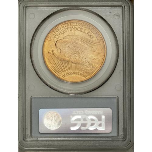 <B>1924<$20> MS68 PCGS.</B></I> Without a doubt, the 1924 Saint-Gaudens twenty is the single most common double eagle, regardless of design, edging out both the 1904 Liberty and 1928 Saint-Gaudens issues. Dave Bowers called this date the "poster coin for the casual buyer," although he was hardly considering an example in Superb MS68 quality. In fact, only three With Motto issues of this design, struck from 1908 to 1933, have received the MS68 grade from PCGS. The other two dates are examples of San Francisco Mint coinage, struck in 1910 and 1925.<BR> This date was not always considered a common issue, but was thought to be a scarcer date until massive quantities were brought back from overseas holdings, beginning in the 1940s and continuing through the 1950s and 1960s. In the second edition of the <I>Guide Book,</B></I> published in 1947, Uncirculated examples of this date were priced at $90, while the most common issues were priced at only $70 to $75. Much has changed in the last 60 years, and knowledge of rare date coins has been refined, especially in light of hoards and treasures that have been discovered since that time. For example, in 1947 the highest priced Saint-Gaudens double eagle was not the 1927-D, but the 1926-D. In fact, the 1926-S and 1927-S issues were also priced higher than the '27-D.<BR> Today, it is believed that over a million examples of the 1924 issue still exist, and yet, the connoisseur of the finest such coins must own this example. The only comparable piece is the single MS68 example certified by NGC. This beauty is fully struck with exquisite orange-gold luster and finely grained satiny surfaces. Both sides are practically flawless and perfect. It is actually possible to count, one at a time, the few tiny ticks on the surfaces, a virtual impossibility on any lower quality example. This design is considered by most to be the most beautiful coinage de