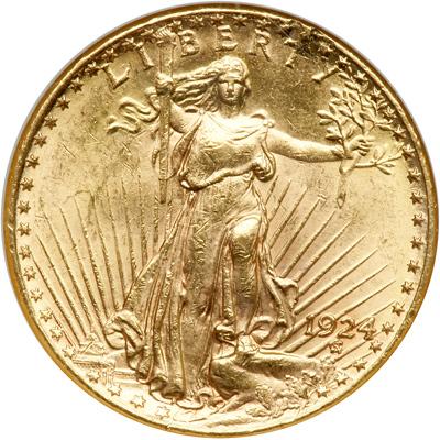 1924 $20. NGC graded MS-62. Untoned. Lustrous surfaces. Minor planchet imperfection above TY in LIBERTY.