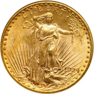 1924 $20. NGC graded MS-63. Warm golden hues are noticeable on both sides. A choice, lustrous coin.