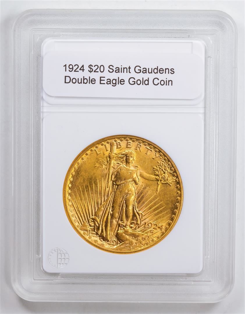 One 1924 $20 Saint Gaudens Double Eagle Gold Coin.