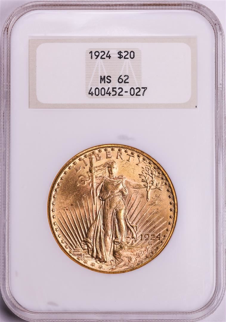 One 1924 $20 St. Gaudens Double Eagle Gold Coin NGC MS62 Old Fatty Holder. NGC Certified.