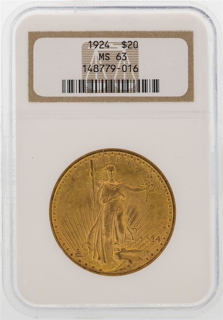 One 1924 $20 St. Gaudens Double Eagle Gold Coin NGC MS63. NGC Certified.