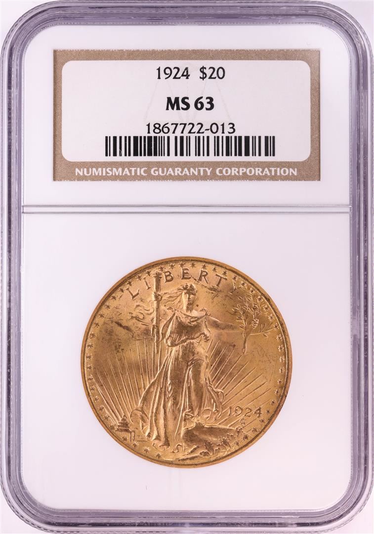 One 1924 $20 St. Gaudens Double Eagle Gold Coin NGC MS63. NGC Certified.