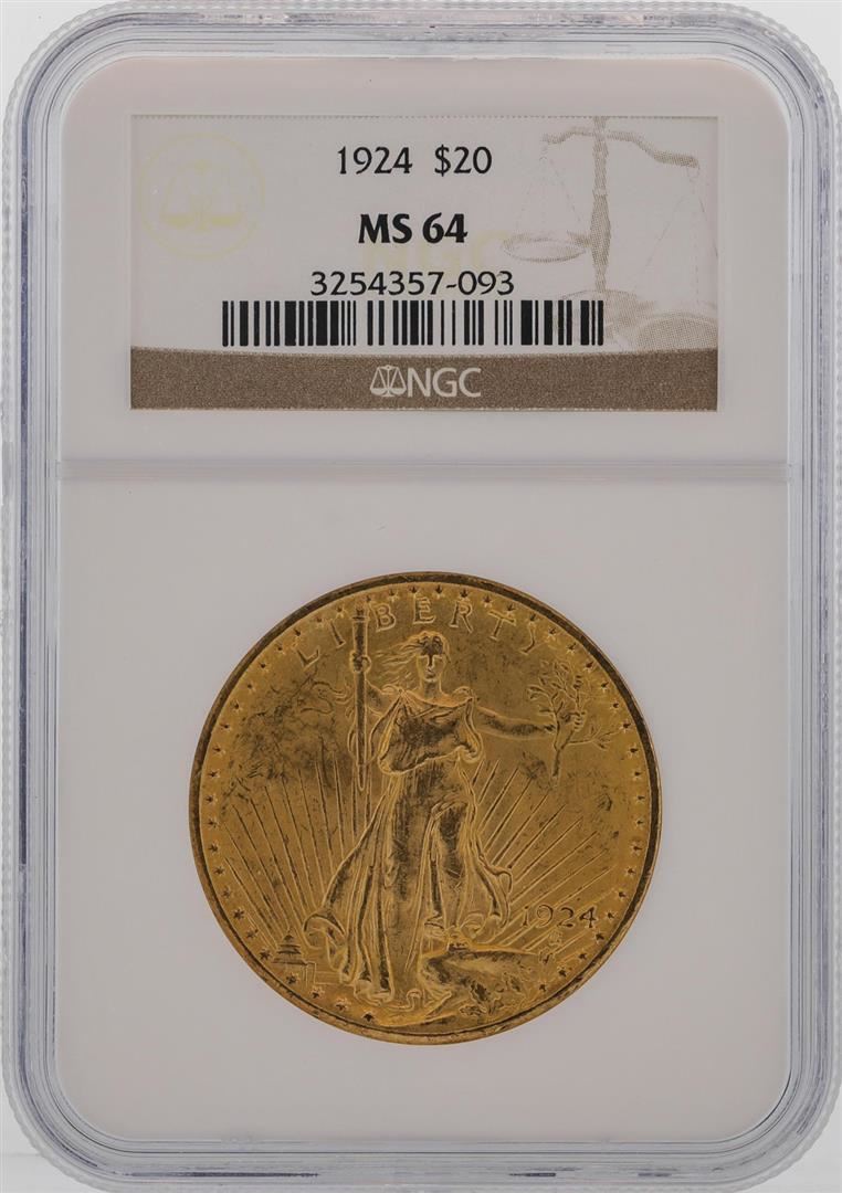 One 1924 $20 St. Gaudens Double Eagle Gold Coin NGC MS64. NGC Certified.