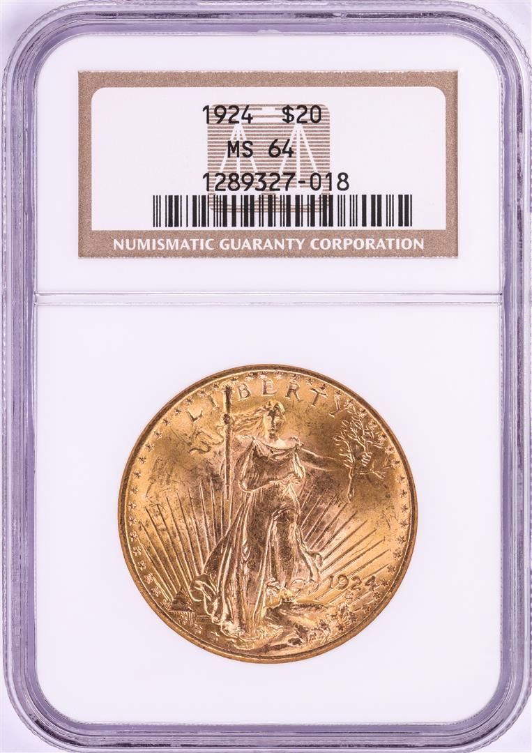 One 1924 $20 St. Gaudens Double Eagle Gold Coin NGC MS64. NGC Certified.