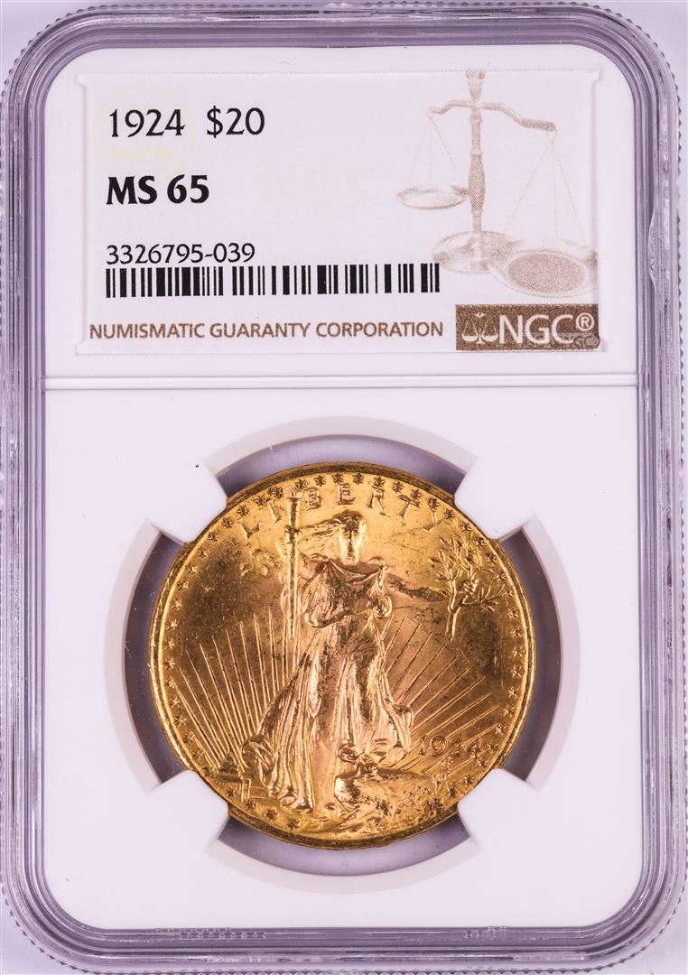 One 1924 $20 St. Gaudens Double Eagle Gold Coin NGC MS65. NGC Certified.