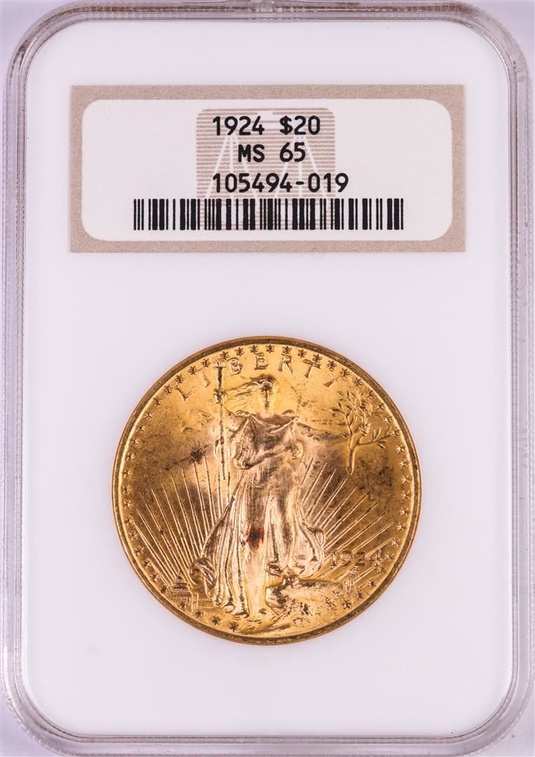 One 1924 $20 St. Gaudens Double Eagle Gold Coin NGC MS65. NGC Certified.