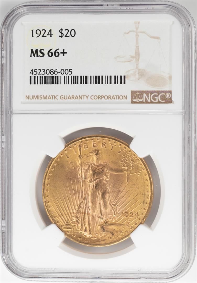 One 1924 $20 St. Gaudens Double Eagle Gold Coin NGC MS66+. NGC Certified.