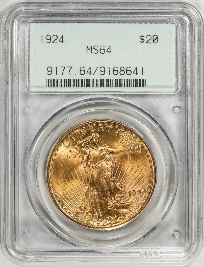 One 1924 $20 St. Gaudens Double Eagle Gold Coin PCGS MS64 Old Generation 2.1 Holder. PCGS Graded.