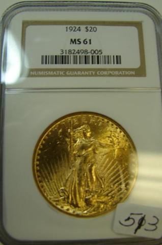 1924 $20 St. Gaudens Gold Coin NGC MS61