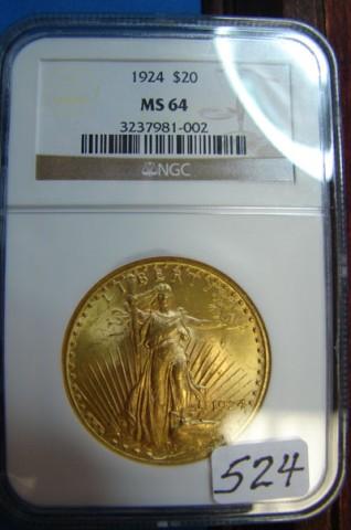 1924 $20 St. Gaudens Gold Coin NGC MS64