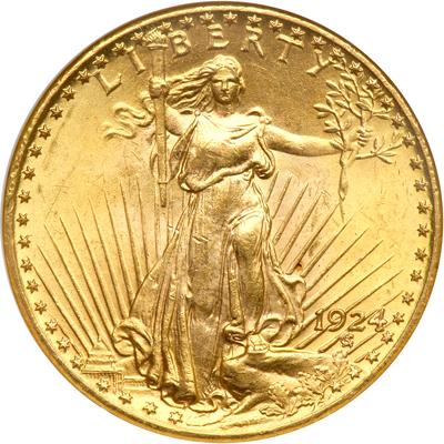 1924 $20 St. Gaudens. NGC graded MS-63. Uncommonly smooth with fully metallic, golden features with a faint trace of pink in the center (PCGS # 9177).