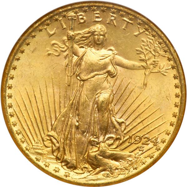 1924 $20 St. Gaudens. NGC graded MS-64. Light golden toning, desirable lustrous specimen whose golden gleam reflects its choice condition (PCGS # 9177) .