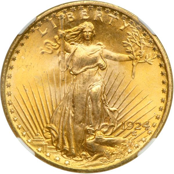 1924 $20 St. Gaudens. NGC graded MS-67. Well struck with lovely golden toning. Pristine golden fields stream light out in every direction. As far as the strike goes, putting the results in a few words we can say it was struck with systematic exactness throughout. A measure of its beauty can be gotten from the supplied photos. But the best way to appreciate this coin's beauty and striking bold relief is from first-hand observation with or without a magnifying glass. It is genuinely Superb. Pop 151; 4 finer (PCGS # 9177) .