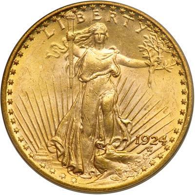 1924 $20 St. Gaudens. PCGS graded MS-63. Attractive color is seen over each side with smooth luster (PCGS # 9177).