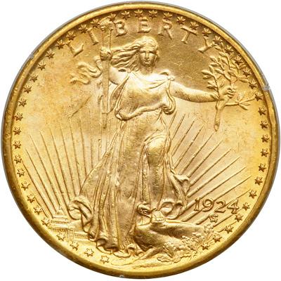 1924 $20 St. Gaudens. PCGS graded MS-63. Housed in a First Generation Holder. A splash of toning exists here and there. Very frosty (PCGS # 9177) .