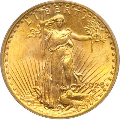 1924 $20 St. Gaudens. PCGS graded MS-64. Nice golden toning. Aesthetically tempting, as fine a looking MS64 with full strike as you are apt to see, and all the while saturated with bright golden bloom, little in the way of marks (PCGS # 9177).