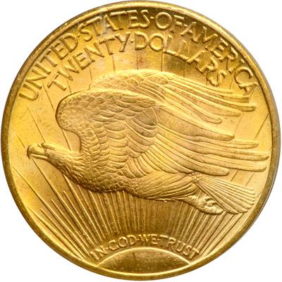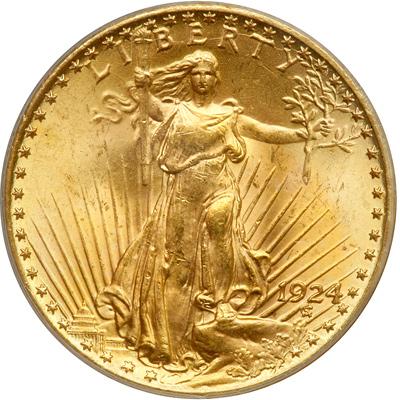 1924 $20 St. Gaudens. PCGS graded MS-64. Booming eye-catching luster that controls everything in this handsome MS64, nothing moderate or subdued, it comes right out with horns blaring and drums beating (PCGS # 9177) .