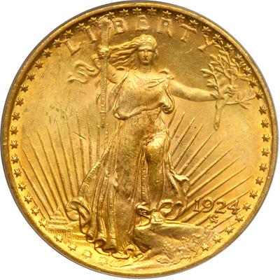 1924 $20 St. Gaudens. PCGS graded MS-64. Golden orange hues displayed on both sides. A number of other things to report, including fresh luster, problem-free rims, no trace of copper spotting, and just overall good eye appeal from this side to the other (PCGS # 9177) .