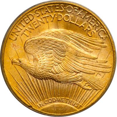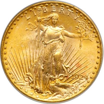 1924 $20 St. Gaudens. PCGS graded MS-64. Lovely golden-orange hues. A couple of spots can be seen on both sides; vibrant luster throughout. This piece ventures close to MS65 level (PCGS # 9177) .