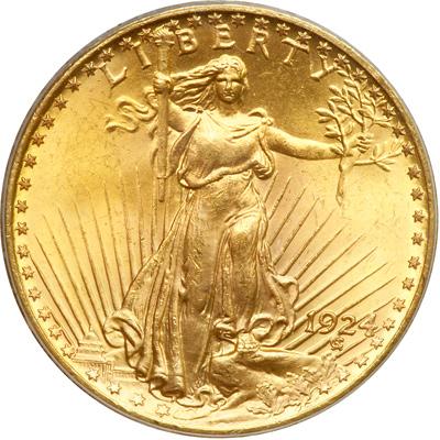 1924 $20 St. Gaudens. PCGS graded MS-64. Sensational cartwheel luster. The obverse shows subtle golden tones while the reverse exhibits rich sunset hues (PCGS # 9177) .