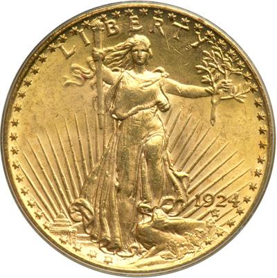 1924 $20 St. Gaudens. PCGS graded MS-64. Untoned with brilliant pinkish gold hues (PCGS # 9177) .