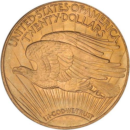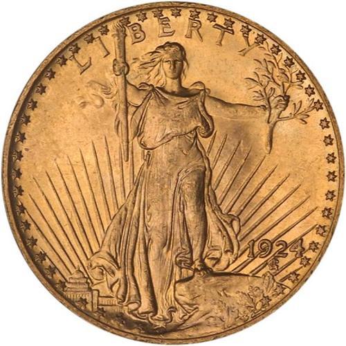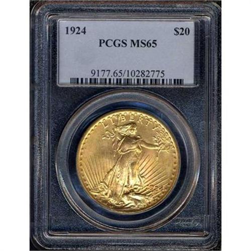 <b>1924 $20 St. Gaudens. PCGS graded MS65.</b> The centers are bright yellow-gold oscillating with mellow orange-gold peripheries. Far from the normal example of this plentiful date is the respectable amount of detail throughout with no signs of weakness to the <b>(PCGS # 9177)</b> <i>