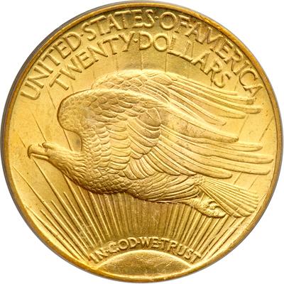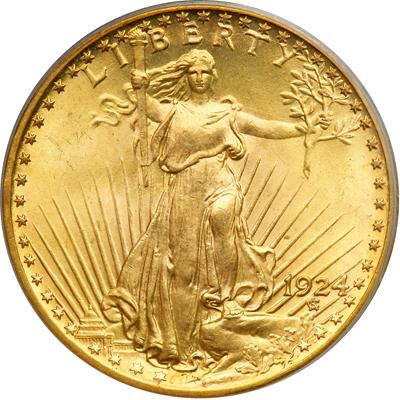 1924 $20 St. Gaudens. PCGS graded MS-66. A common date high quality coin for this year, and an example which displays almost enthralling golden color whose satin surface is bright, with sharp detail throughout (PCGS # 9177).