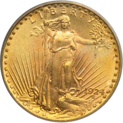 1924 $20 St. Gaudens. PCGS graded MS-66. Frosty with lovely golden toning. Desirable with this precision strike on Liberty and eagle. A gem (PCGS # 9177) .