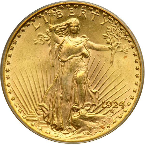 1924 $20 St. Gaudens. PCGS Genuine, scrached on reverse. Our grade is MS-64 with a fine pin scratch on the reverse. 1400.