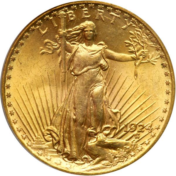 1924. PCGS graded MS-65. A brilliant golden gem specimen. It is always nice to be able to offer a sparkling 1924 Saint with bright, untoned surfaces and a commanding strike (PCGS # 9177) .