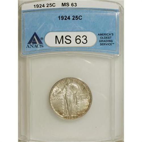 <B>1924 25C MS63 ANACS.</B></I> NGC Census: (83/341). PCGS Population (147/352). Mintage: 10,920,000. Numismedia Wsl. Price for NGC/PCGS coin in MS63: $160. (#5746)<BR><BR><B>Coin Engraver:</B> Hermon A. MacNeil<BR><BR><b>Shipping:</b> Coins & Currency (<a target="_blank" href="http://www.heritageauctions.com/common/shipping.php">view shipping information</a>\)