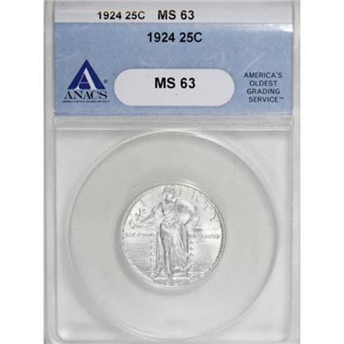 <B>1924 25C MS63 ANACS.</B></I> NGC Census: (82/344). PCGS Population (149/354). Mintage: 10,920,000. Numismedia Wsl. Price for NGC/PCGS coin in MS63: $180. (#5746)<BR><BR><B>Coin Engraver:</B> Hermon A. MacNeil<BR><BR><b>Shipping:</b> Coins & Currency (<a target="_blank" href="http://www.heritageauctions.com/common/shipping.php">view shipping information</a>)