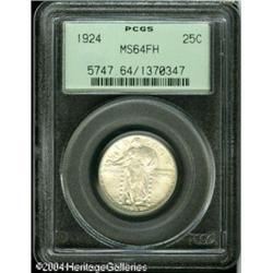 1924 25C MS64 Full Head PCGS. The obverse features <B>1924 25C MS64 Full Head PCGS.</B></I> The obverse features a light coat of olive-gray toning, while the reverse displays bright, fully lustrous surfaces that are virtually untoned. Sharply struck, with a few marks located on the eagle's left wing. <BR><BR><B>Important notice:</B> Heritage usually auctions material at the rate of 200-250 lots per hour. On some occasions eBay Live bid software or the Internet may not be able to keep up with the pace of the auction. We recommend placing a realistic absentee bid now as insurance to avoid disappointment. Occasionally the auctioneer may eliminate or reject an eBay Live bid, and the auctioneer may also reopen a lot after the close of the eBay live bidding (usually because we missed an audience bid), and may reject your bid even if it shows you as the winning bidder. By bidding via eBay Live, you agree that Heritage may award the lot to another bidder at its sole discretion under the circumstances described above or any other reasonable circumstances. Since eBay bids are not shown to us until we open the lot on the floor, we treat those bids just like floor bids. In most cases the floor responds before the eBay bid is presented to us, due to Internet lag time, so for consistency we have made it a policy that floor bids are always considered first over tie eBay live bids. Also please note that all Heritage lots purchased through eBay Live carry a 20% Buyer's Premium. Please make sure you read the Terms and Conditions before you bid. This lot is being auctioned in conjunction with a live floor auction by Heritage Galleries & Auctioneers. All final auction and invoice information will be supplied by Heritage Galleries & Auctioneers, and all other information should be considered preliminary. Lot:5955
