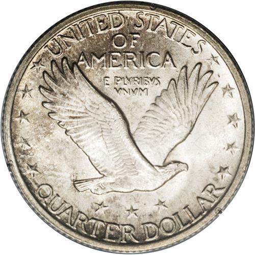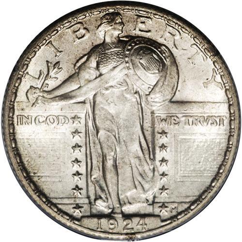 <B>1924<25C> MS65 Full Head PCGS.</B></I> The 1924 is one of the more frequently encountered P-mints of the Type Two design, which was altered the next year to recess the date. This is a beautiful coin that has the thick mint frost that is often seen on well-preserved Standing Liberty quarters. The surfaces also are originally preserved with lilac color on the obverse and golden-brown patina over the reverse. Population: 48 in 65, 35 finer (4/06).