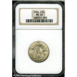 1924 25C MS65 NGC. Sky-blue and honey-gold colors <B>1924 25C MS65 NGC.</B></I> Sky-blue and honey-gold colors grace this lustrous and impressively preserved Gem. Although the center of Liberty's head has slight softness, the strike is otherwise crisp. <BR><BR><B>Important notice:</B> Heritage usually auctions material at the rate of 200-250 lots per hour. On some occasions eBay Live bid software or the Internet may not be able to keep up with the pace of the auction. We recommend placing a realistic absentee bid now as insurance to avoid disappointment. Occasionally the auctioneer may eliminate or reject an eBay Live bid, and the auctioneer may also reopen a lot after the close of the eBay live bidding (usually because we missed an audience bid), and may reject your bid even if it shows you as the winning bidder. By bidding via eBay Live, you agree that Heritage may award the lot to another bidder at its sole discretion under the circumstances described above or any other reasonable circumstances. Since eBay bids are not shown to us until we open the lot on the floor, we treat those bids just like floor bids. In most cases the floor responds before the eBay bid is presented to us, due to Internet lag time, so for consistency we have made it a policy that floor bids are always considered first over tie eBay live bids. Also please note that all Heritage lots purchased through eBay Live carry a 20% Buyer's Premium. Please make sure you read the Terms and Conditions before you bid. This lot is being auctioned in conjunction with a live floor auction by Heritage Galleries & Auctioneers. All final auction and invoice information will be supplied by Heritage Galleries & Auctioneers, and all other information should be considered preliminary. Lot:5954