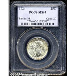 1924 25C MS65 PCGS. Just a hint of golden patina shows on this mostly untoned example. Well defined although lacking some highpoint detail, a satiny Gem piece. Important notice: Heritage usually auctions material at the rate of 200-250 lots per hour. On some occasions eBay Live bid software or the Internet may not be able to keep up with the pace of the auction. We recommend placing a realistic absentee bid now as insurance to avoid disappointment. Occasionally the auctioneer may eliminate or reject an eBay Live bid, and the auctioneer may also reopen a lot after the close of the eBay live bidding (usually because we missed an audience bid), and may reject your bid even if it shows you as the winning bidder. By bidding via eBay Live, you agree that Heritage may award the lot to another bidder at its sole discretion under the circumstances described above or any other reasonable circumstances. Also please note that all Heritage lots purchased through eBay Live carry a 20% Buyer's Premium. Please make sure you read the Terms and Conditions before you bid.
