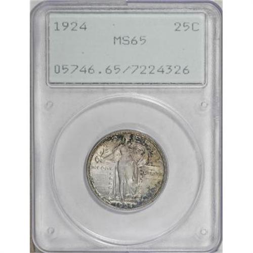 <B>1924 25C MS65 PCGS.</B></I> PCGS Population (109/27). NGC Census: (94/70). Mintage: 10,920,000. Numismedia Wsl. Price for NGC/PCGS coin in MS65: $460. (#5746)<BR><BR><B>Coin Engraver:</B> Hermon A. MacNeil<BR><BR><b>Shipping:</b> Coins & Currency (<a target="_blank" href="http://www.heritageauctions.com/common/shipping.php">view shipping information</a>)