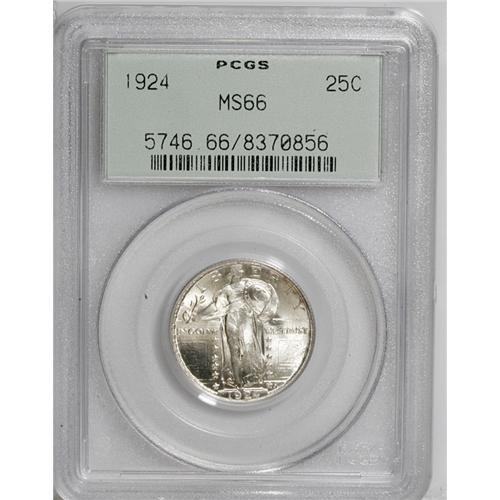 <B>1924<25C> MS66 PCGS.</B></I> Great luster is the most outstanding feature of this Premium Gem. Traces of russet and blue appear at the periphery, but the rest of this well struck coin is untoned. Housed in a green label holder.