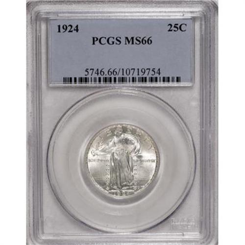 <B>1924 25C MS66 PCGS.</B></I> Though Liberty's head shows slight softness on this Premium Gem, the overall definition is excellent. Strong, swirling luster and slightly frosty devices combine for immense eye appeal on this essentially silver-white representative. Population: 19 in 66, 9 finer (2/08).<BR><BR><B>Coin Engraver:</B> Hermon A. MacNeil<BR><BR><b>Shipping:</b> Coins & Currency (<a target="_blank" href="http://www.heritageauctions.com/common/shipping.php">view shipping information</a>)
