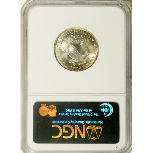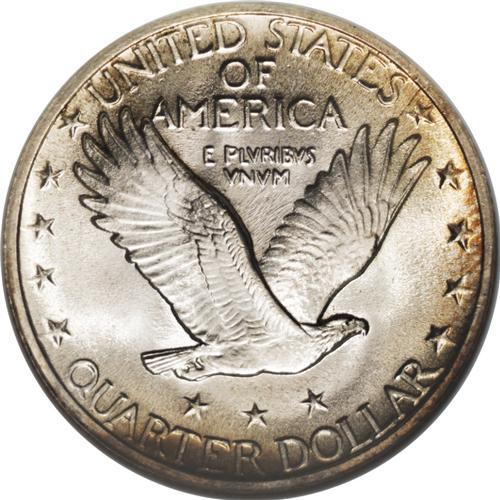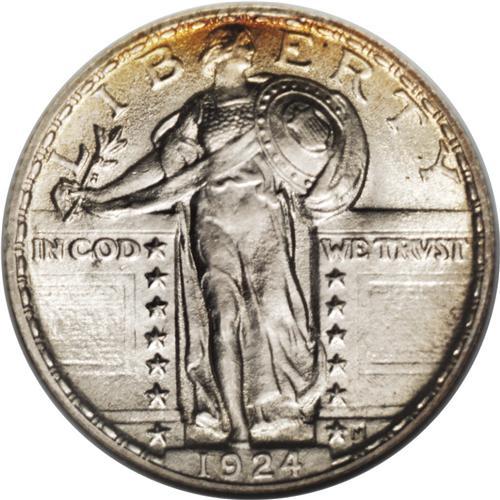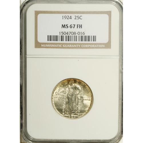 <B>1924 25C MS67 Full Head NGC.</B></I> Most high-end coins of this issue, including the present piece, appear to have been struck from rusted or matte-like dies, as the surfaces show a fine, granular texture. This lovely piece offers glimpses of gold and amber near the peripheries on each side, with brilliant silver centers. The strike is sharp elsewhere as well, and there are essentially no distractions. A small die crack connects the reverse left (facing) wingtip with the rim. Census: 10 in 67, 1 finer (1/07).<BR><BR><b>Shipping:</b> Coins & Currency (<a target="_blank" href="http://www.heritageauctions.com/common/shipping.php">view shipping information</a>)