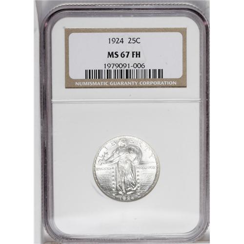 <B>1924<25C> MS67 Full Head NGC.</B></I> What a pleasure it is to examine this beautiful and conditionally scarce Superb Gem quarter. The obverse striking details are beyond reproach, and the reverse is nearly as well detailed, only showing slight weakness on the eagle's breast feathers. The matte-like surfaces are completely brilliant, highly lustrous, and virtually pristine. Census: 9 in 67, 1 finer (9/06).