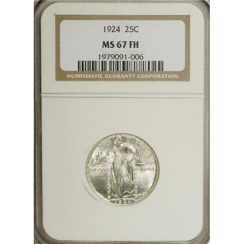 <B>1924 25C MS67 Full Head NGC.</B></I> What a pleasure it is to examine this beautiful and conditionally scarce Superb Gem quarter. The obverse striking details are beyond reproach, and the reverse is nearly as well detailed, only showing slight weakness on the eagle's breast feathers. The matte-like surfaces are completely brilliant, highly lustrous, and, except for a small milling mark on the eagle's right (facing) wing, virtually pristine. Census: 11 in 67 Full Head, 1 finer (3/07).<BR><BR><b>Shipping:</b> Coins & Currency (<a target="_blank" href="http://www.heritageauctions.com/common/shipping.php">view shipping information</a>)