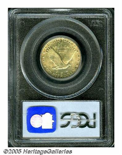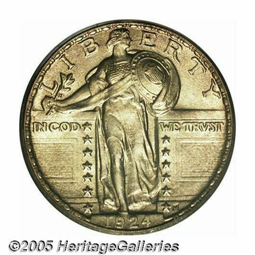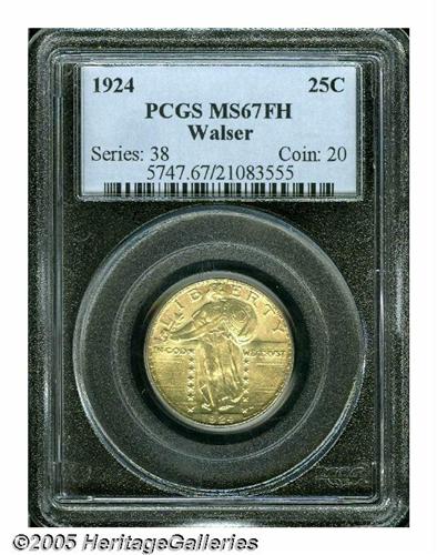 <B>1924<25C> MS67 Full Head PCGS.</B></I> While certainly not the most difficult date in this series to locate with Full Head definition, few sharply struck 1924 Quarters have survived with surfaces as smooth as those of the present Superb Gem. There is not a single mentionable abrasion on either side, and the features have been finished with frosty luster. The devices are well struck up and a pleasing layer of medium golden color amply coats each side. Both major grading services combined report 13 coins in MS67 Full Head, and there are none finer (5/05).<BR><I>From The Western Hills Collection.</B></I>