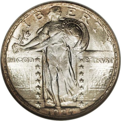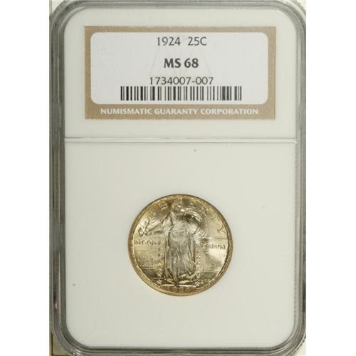 <B>1924 25C MS68 NGC.</B></I> This is a remarkably attractive coin that exhibits gleaming, frosty luster over silver surfaces that reveal light golden iridescence near the peripheries. The striking details are bold, and a mere whisper away from the Full Head category. The date and the shield rivets are crisply impressed, and both sides of the piece are essentially pristine. One of just six examples to receive the MS68 grade designation, at NGC and PCGS combined, with none certified any finer by either service. NGC Census: 5 in 68, 0 finer (1/07).<BR><BR><b>Shipping:</b> Coins & Currency (<a target="_blank" href="http://www.heritageauctions.com/common/shipping.php">view shipping information</a>)