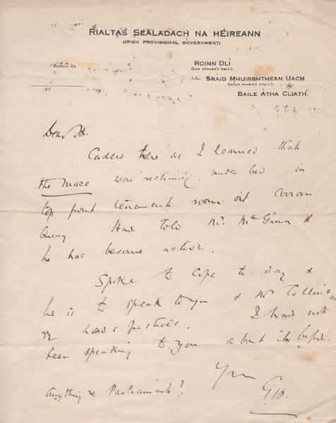 Kennedy’s own handwritten draft of the very formal document for the transfer of the business of the Courts from Dublin Castle to King’s Inn, including setting out the official Irish title for The Circuit Court of Justice as “An Chuirt Breitheamhnais Chuarda”, 2pp note answering a suggestion that he was opposed to Wigs being worn in Court, and in which Kennedy writes of the major reforms that have already taken place in the High Court and Supreme Court, typewritten memo to Gerald Horan KC directing that Irish Justices should be addressed in Court as ‘Sir’ rather than ‘My Lord’ as in former practice, and a copy letter advising the President on whether or not to move the Statue of Justice at Dublin Castle, November1926. . These documents show the architects of Irish State taking a multitude of decisions in its earliest days