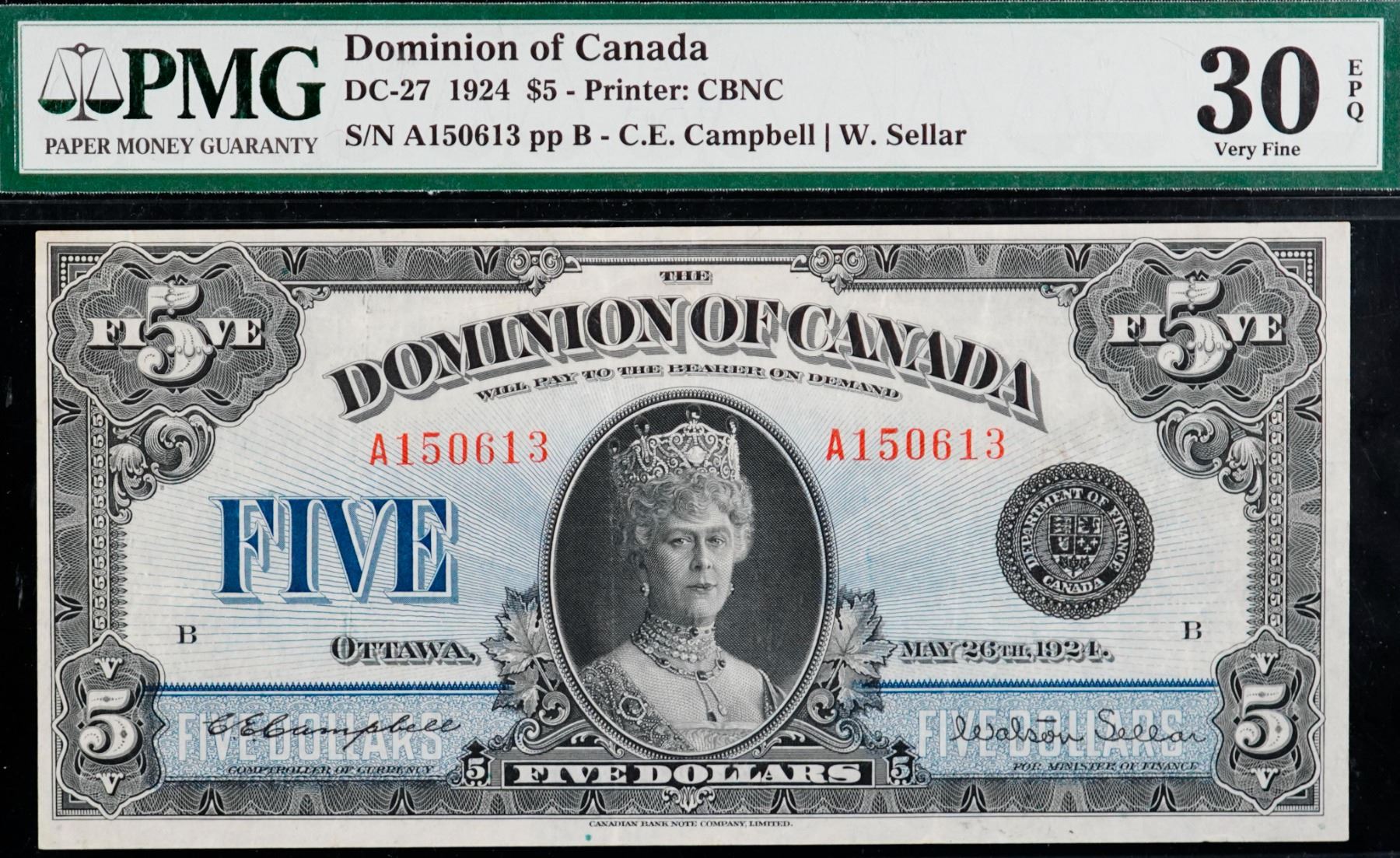 1924 $5 DC-27 #A150613 PMG Choice Very Fine-30EPQ. This is a bright, clean and attractive issue with nice eye appeal. A similar example brought in $10,665 at our 2023 first Extravaganza sale.