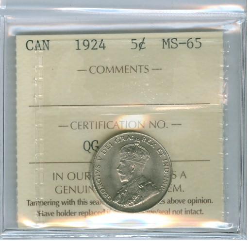 1924 5¢ ICCS MS65. WOW!!! Tied for finest graded. Amazing lustre with great fields and surfaces. Very scarce in this top condition. Worth a premium bid!