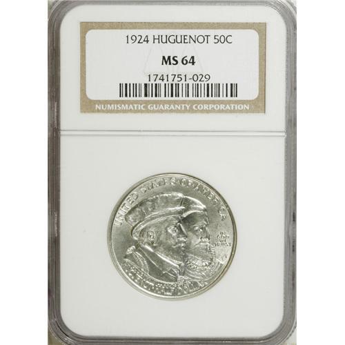 <B>1924 50C Huguenot MS64 NGC.</B></I> NGC Census: (1212/1195). PCGS Population (1346/1173). Mintage: 142,080. Numismedia Wsl. Price for NGC/PCGS coin in MS64: $200. (#9314)<BR><BR><b>Shipping:</b> Coins & Currency (<a target="_blank" href="http://www.heritageauctions.com/common/shipping.php">view shipping information</a>)